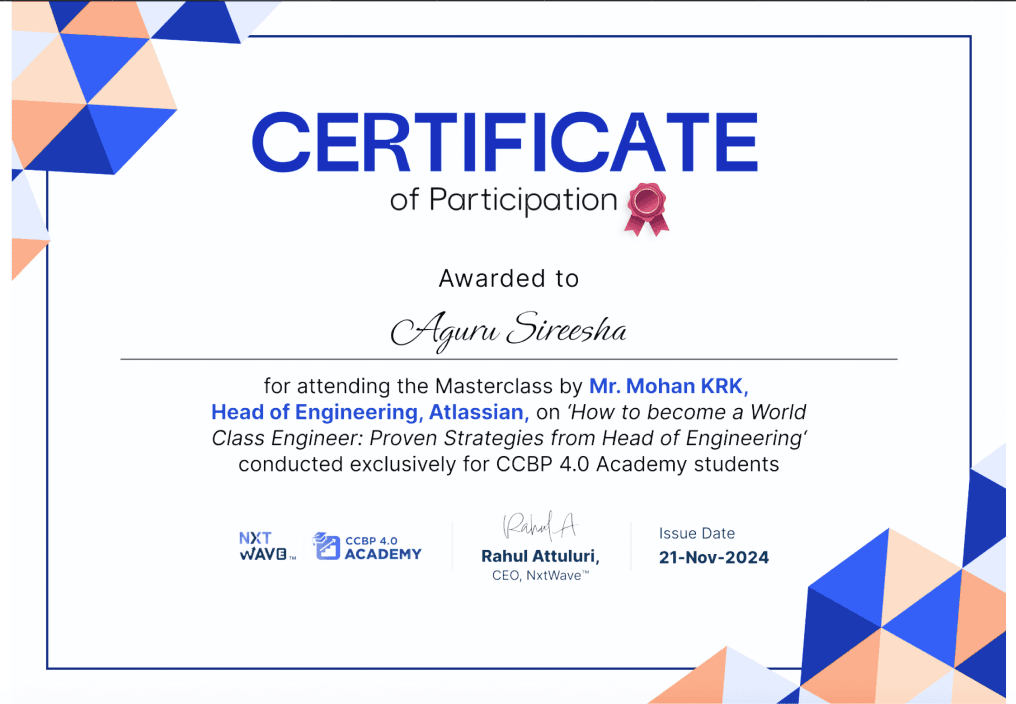 for attending the Masterclass by Mr. Mohan KRK, Head of Engineering, Atlassian, on 'How to become a World Class Engineer: Proven Strategies from Head of Engineering' conducted exclusively for CCBP 4.0 Academy students