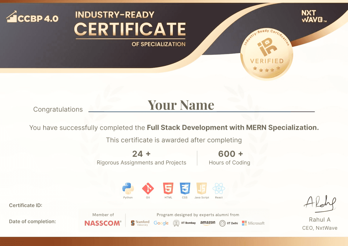 You have successfully completed the Full Stack Development with MERN Specialization. This certificate is awarded after completing